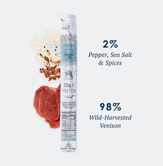 Peppered 10 introduces organ into our snack line—with 5% liver and 5% heart in every stick—harnessing the nutritional power of Axis deer organs without any of the organ flavors. Our newest stick offers the same delicious and lightly peppered flavor of our fan-favorite Peppered Stick and is great for customers who are looking for a nutrition boost with significant concentrations of Vitamins A, B2, B6, B12, Iron, Fatty Acids, Amino Acids and Phytonutrients.